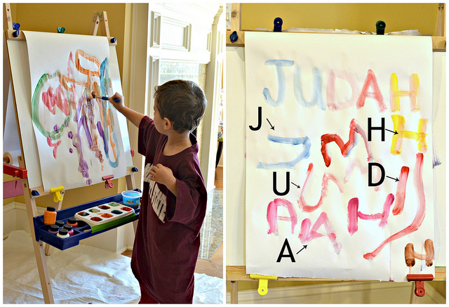 My parents bought Judah this Melissa & Doug art easel for his 2nd birthday, but since we moved shortly after receiving it in the mail and then didn't have room for it during our one-year stint in campus housing, we finally just now put it together and have it in our house. I love it! But, more importantly, Judah loves it! He wants to paint every day. This week, I worked with him on painting the letters of his name. He added a few extra letters in there (like "M") but it was fun to see his own interpretation of each letter to his name. The "D" cracked me up, but he did really well with the letter "H"! 😉