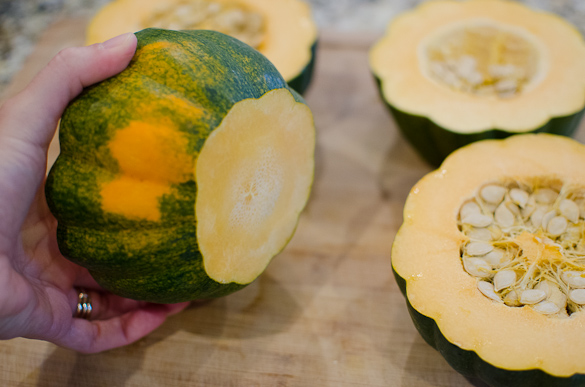 - Slice acorn squash in half and scoops out seeds.