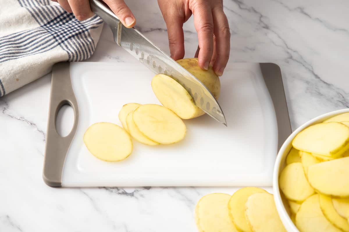 - To ensure even baking, try your best to evenly slice the potatoes with the same thickness. I use my knife, but a mandoline gets the job done faster.