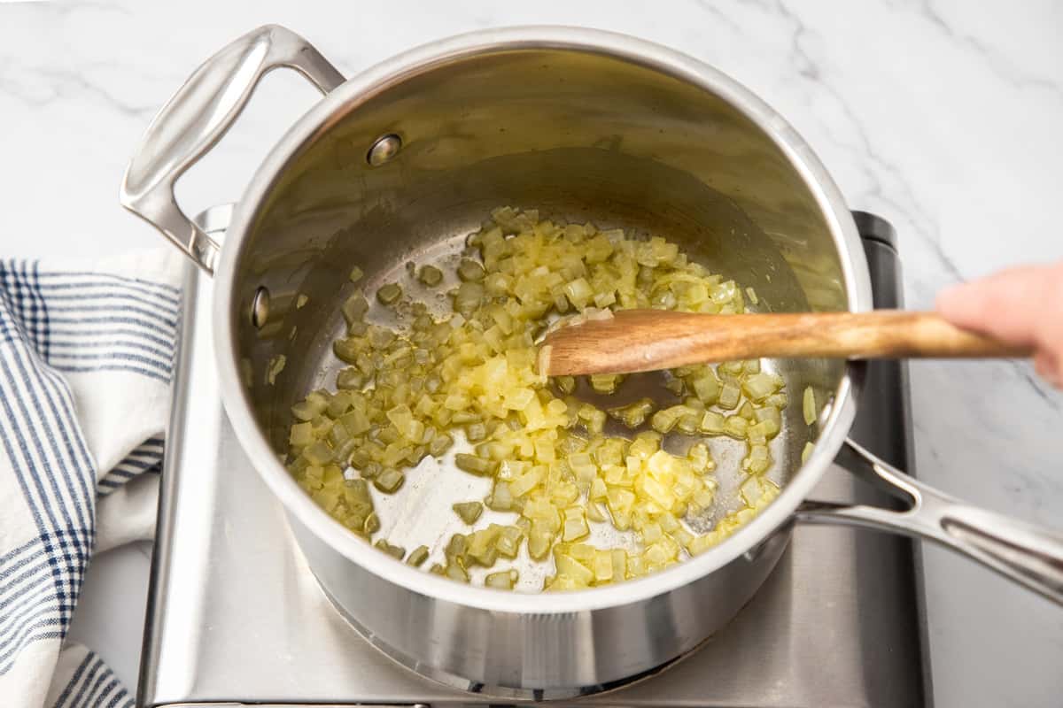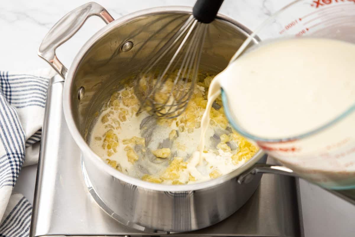 - Cook onions and garlic in a medium pot with butter. Whisk in the flour.
