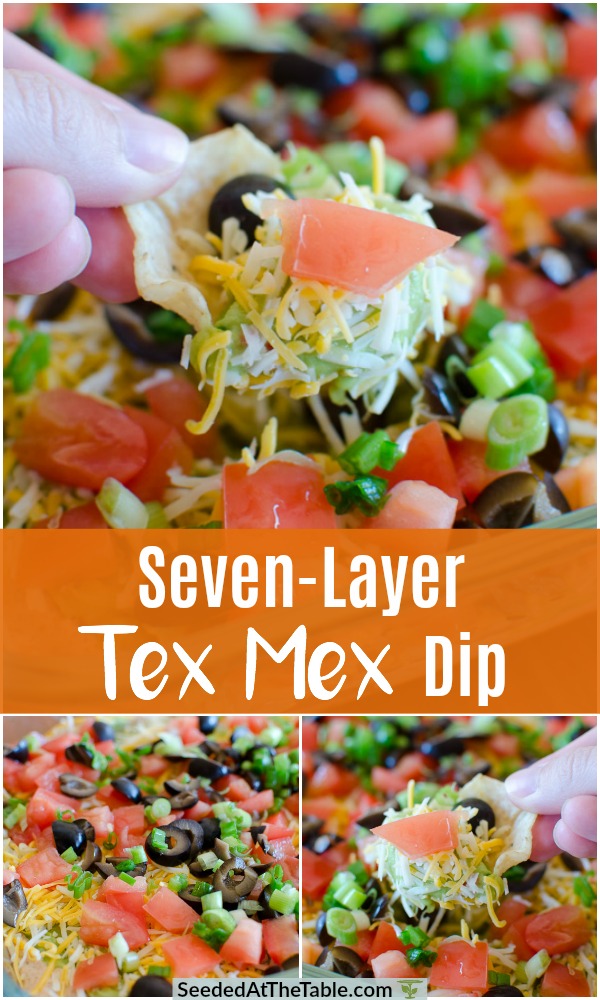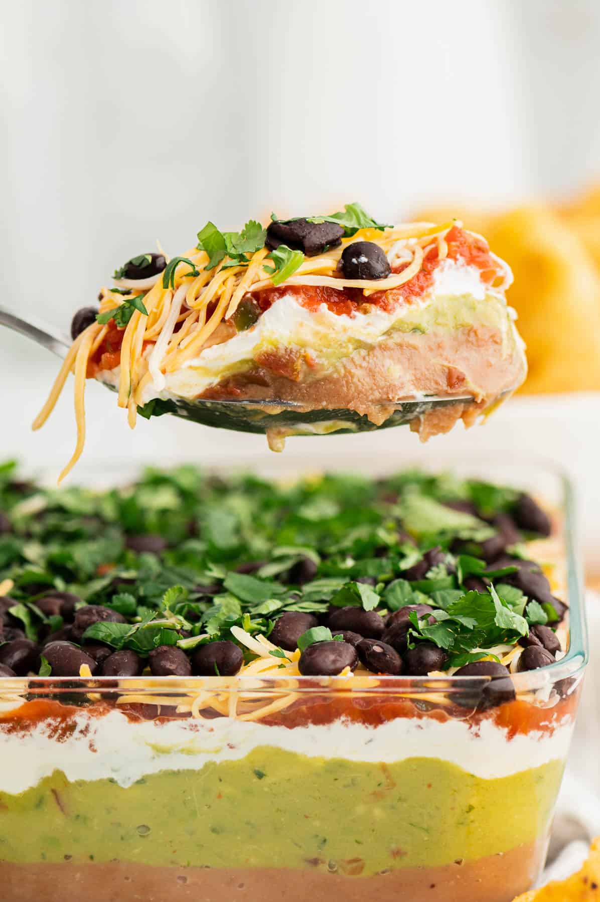 This 7 layer dip is a quick and easy party appetizer loaded with flavor. It's the best Mexican dip with 7 layers of delicious ingredients. Serve with tortilla chips or scoops!