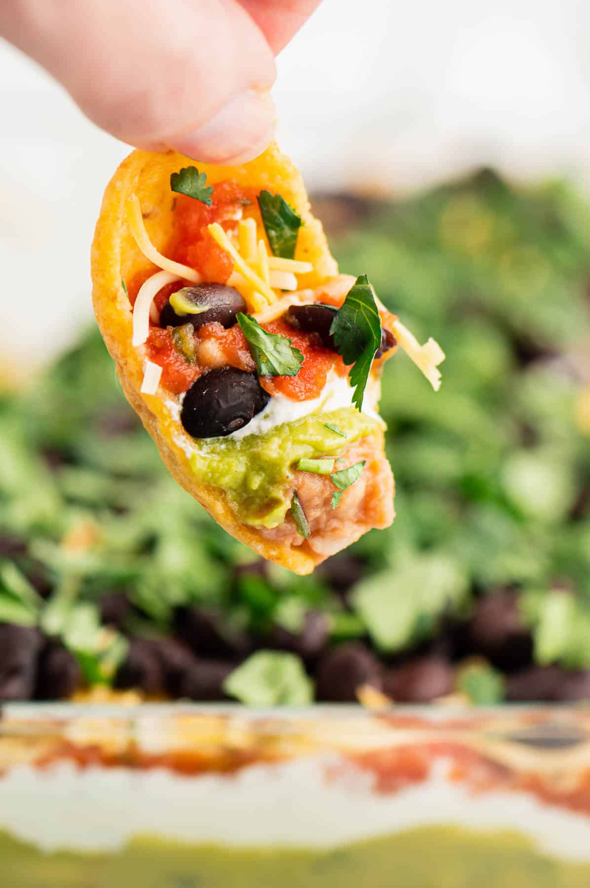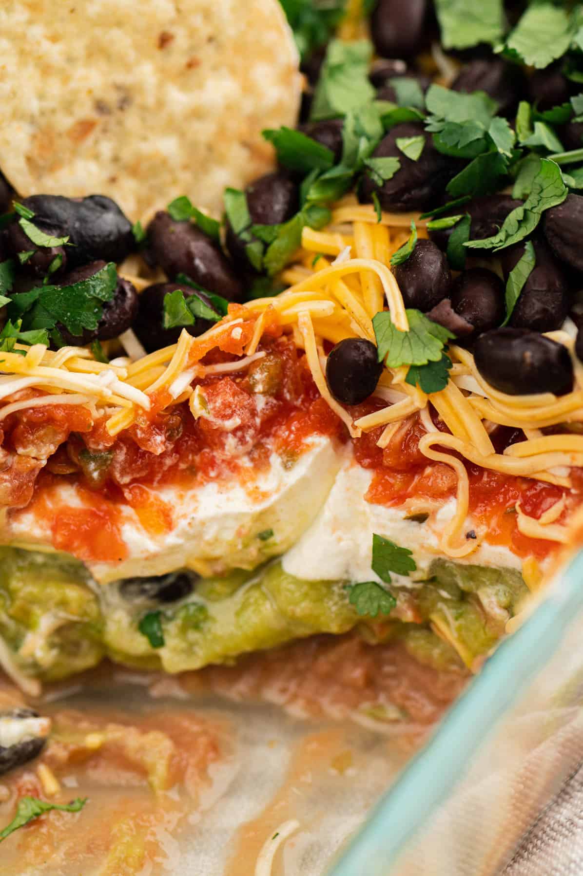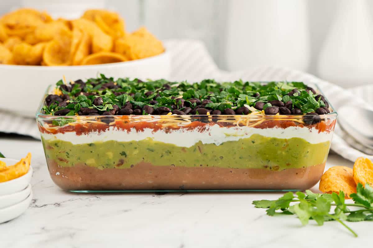 You can use any casserole dish to serve this layered dip recipe. I like to keep the dish around the size of 11 inches. You can also easily halve this recipe and use a much smaller serving dish. The recipe is so versatile to fit just about any size.