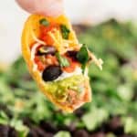 You can turn this layered dip into a meal simply by adding a layer of beef taco meat. If I add meat, I usually place it on the top before the garnishes, but any layer is great!