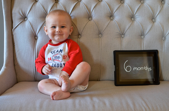 Over Thanksgiving (at 7 months), he learned to push himself to a sit-up position. We're no longer concerned of him sitting up and falling over anymore. He's sturdy and in control!