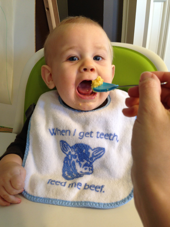 Between meals, he also still has his 6 ounce bottles every 3-4 hours. He is in love with his bottle, but I am planning to take it away from him the day he turns one, just like we did with Judah. And, with Judah it was no big deal...at.all. Simon, on the other hand, seems to be more attached. We'll see how that goes in ...4 months?!