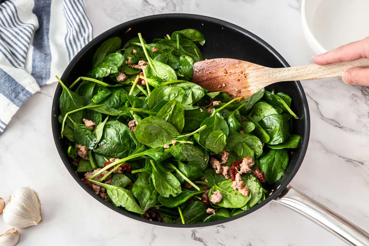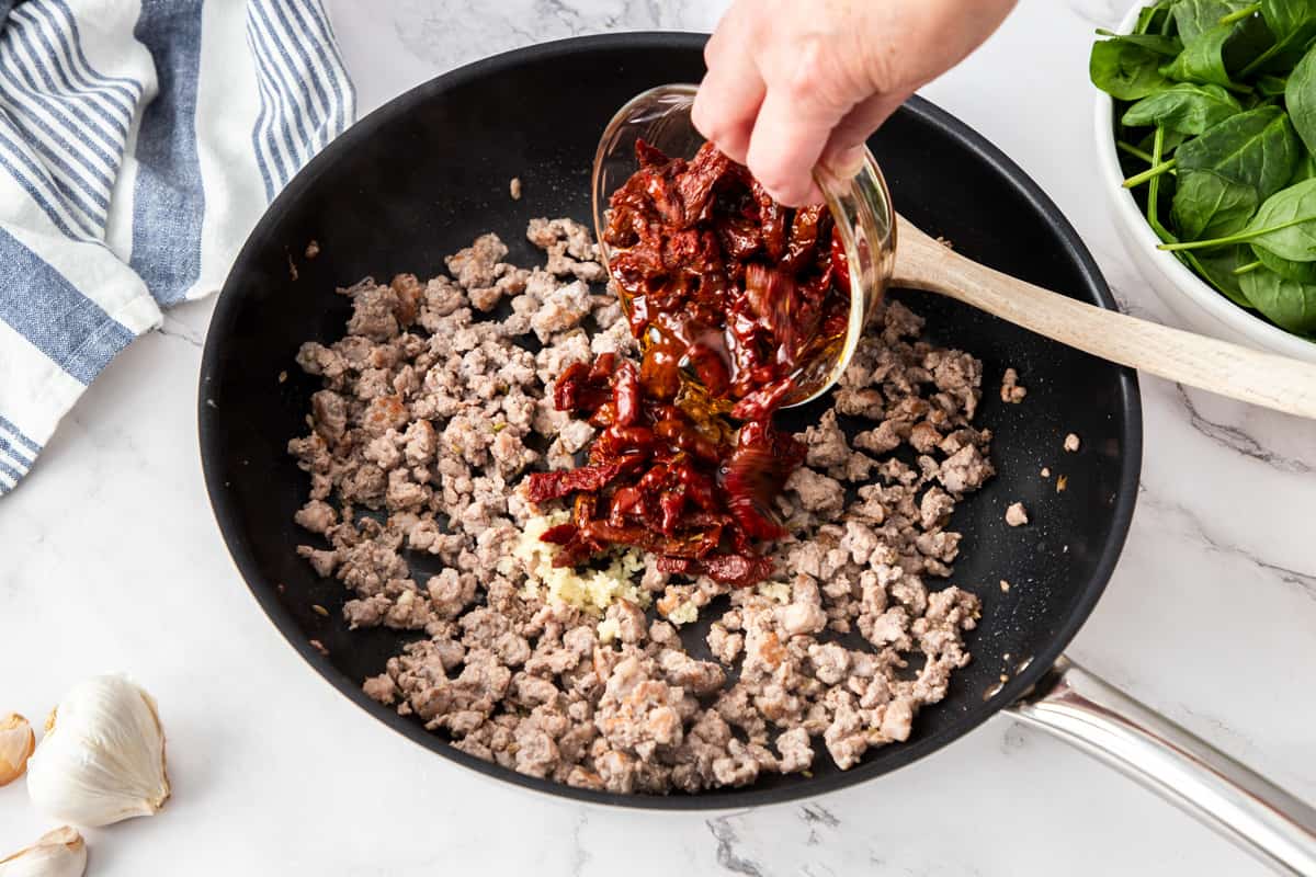 - Brown sausage in a large skillet over medium high heat. Break into small pieces until cooked through. Add garlic and sundried tomatoes (include oil in jar). Cook 2 more minutes.