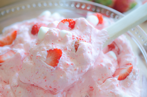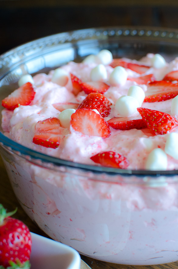 Why is it called strawberry fluff? Because that's exactly how I would describe this dessert (or side dish)! It's fluffy because of the cool whip and marshmallows and loaded with strawberry flavor from the strawberry Jell-O and fresh strawberry slices. It's like eating strawberry flavored clouds!