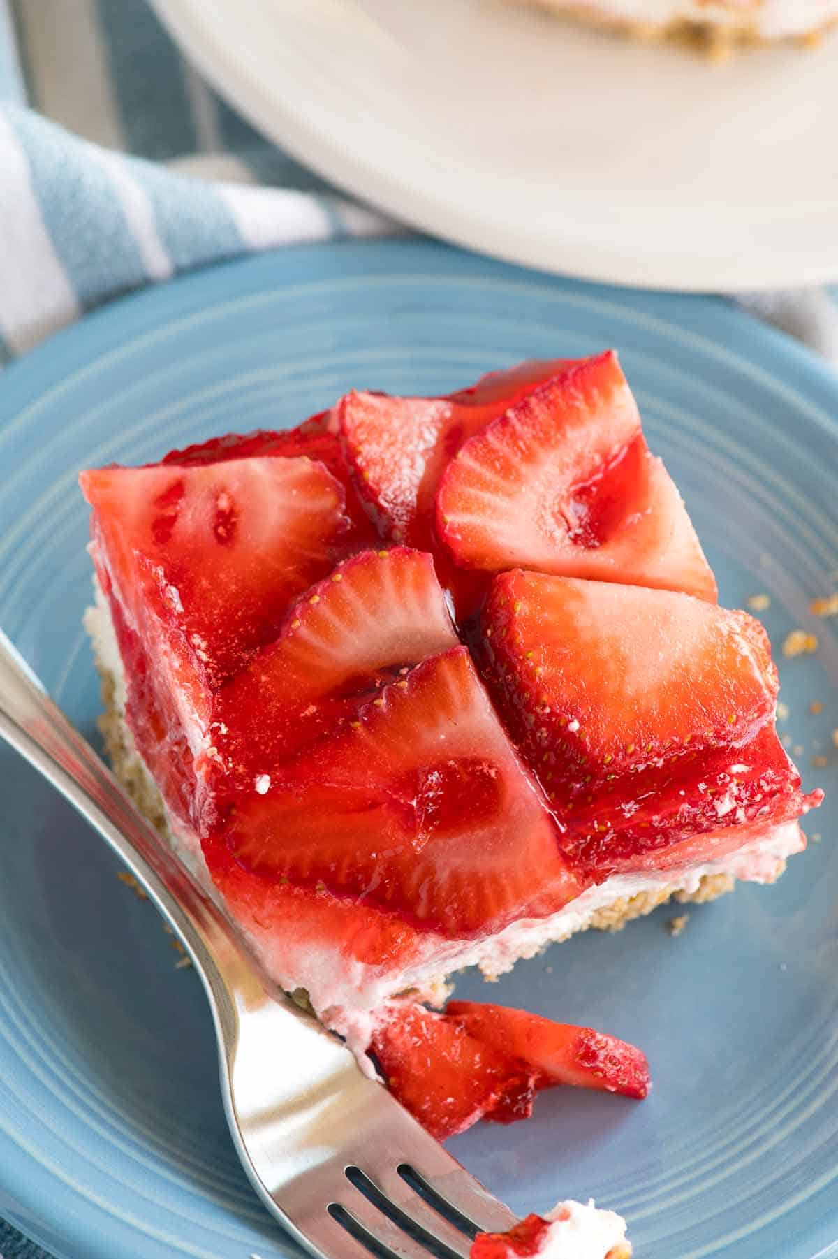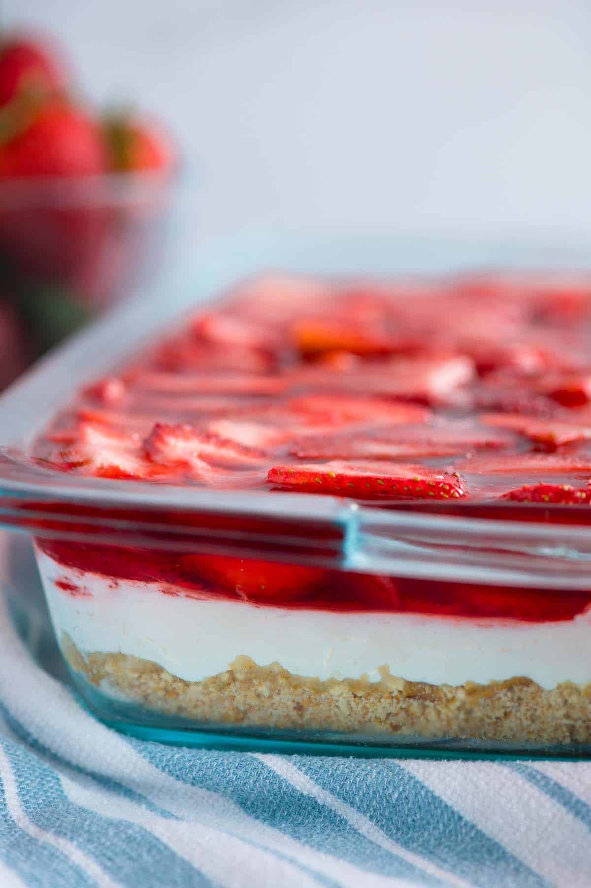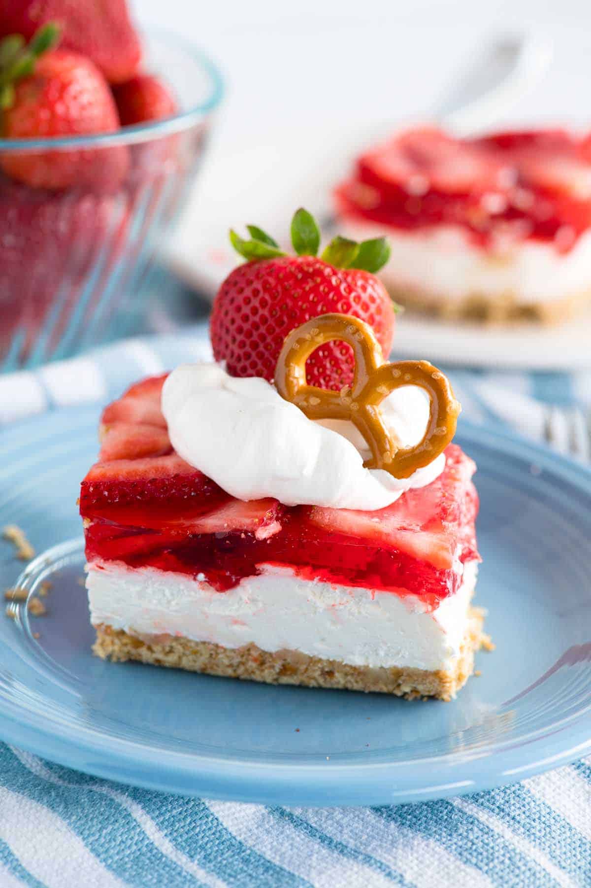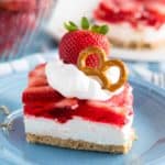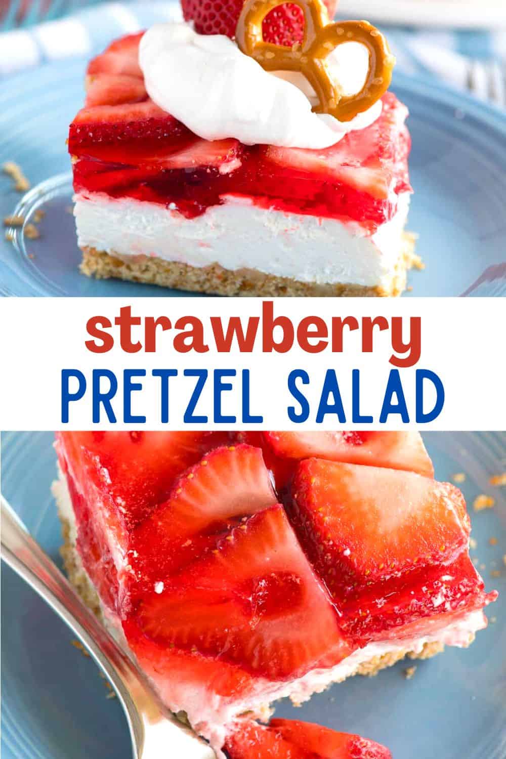 Strawberry pretzel salad is an easy dessert with a buttery pretzel crust and a no-bake cheesecake layer topped with fresh strawberries and Jell-O. A delicious make-ahead dessert!