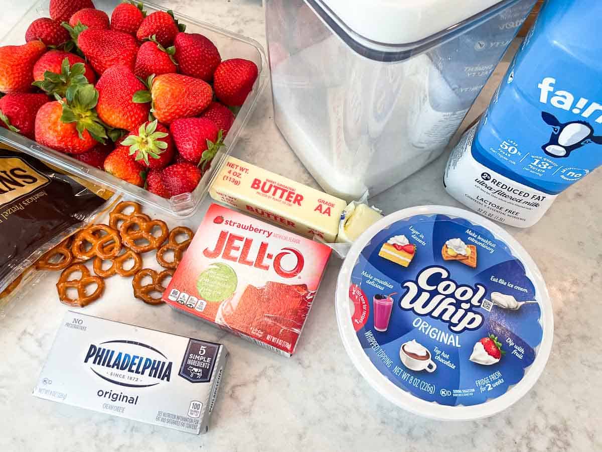 You can easily find everything you need for strawberry pretzel salad at your local grocery store. Below is a photo and the list of ingredients.