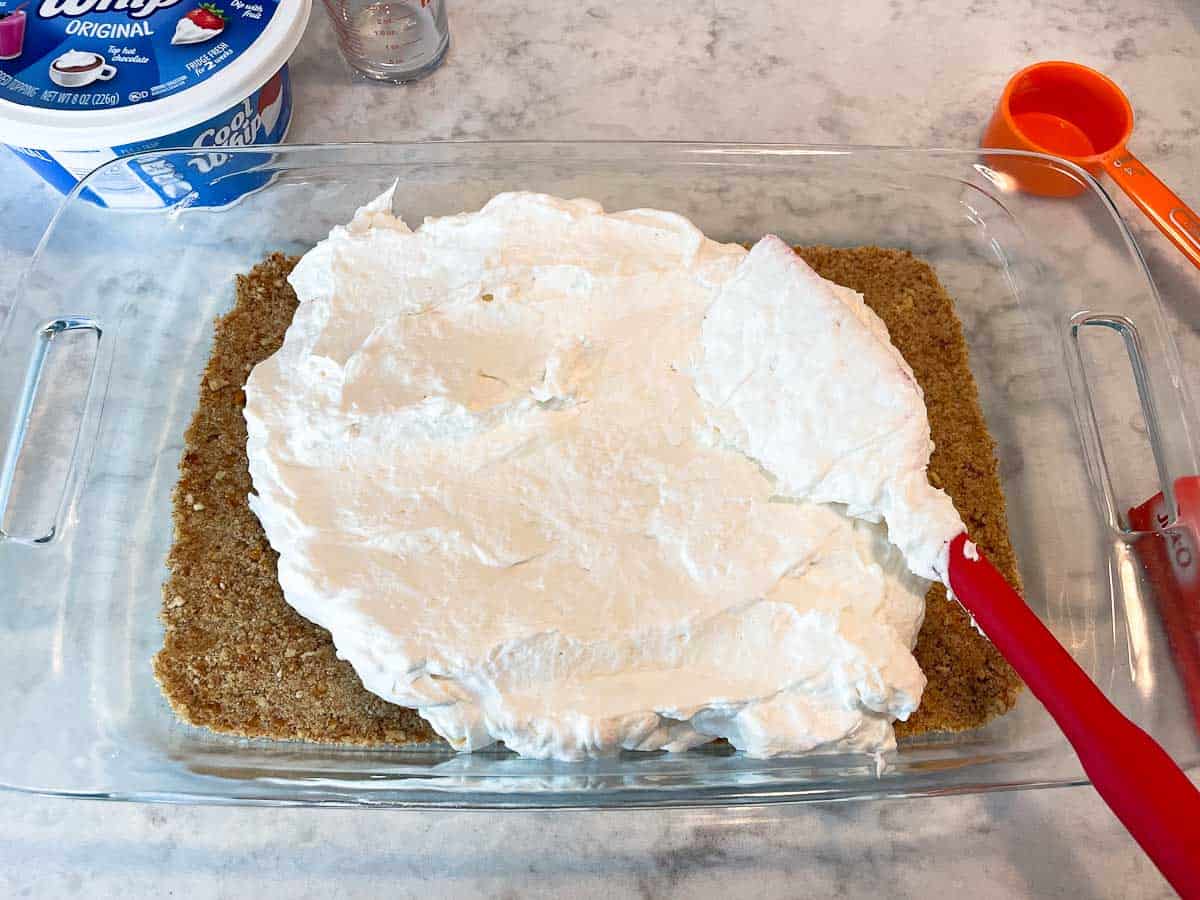 - Once the crust is cooled to room temperature, make the filling. In a large mixing bowl, cream together the cream cheese, sugar and milk until smooth. Fold in the whipped cream, then spread the filling evenly over the cooled crust. Refrigerate 1 hour.