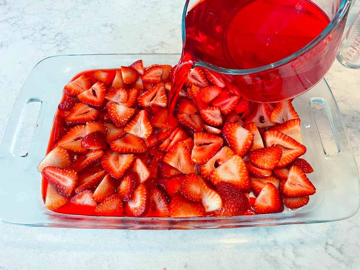 - After 1 hour, place the sliced strawberries evenly over top the cream cheese layer. Pour cooled jello mixture over the strawberries. Do not fill to the top or it can spill when transferring to fridge in next step. It is possible you may not use all of the jello liquid.