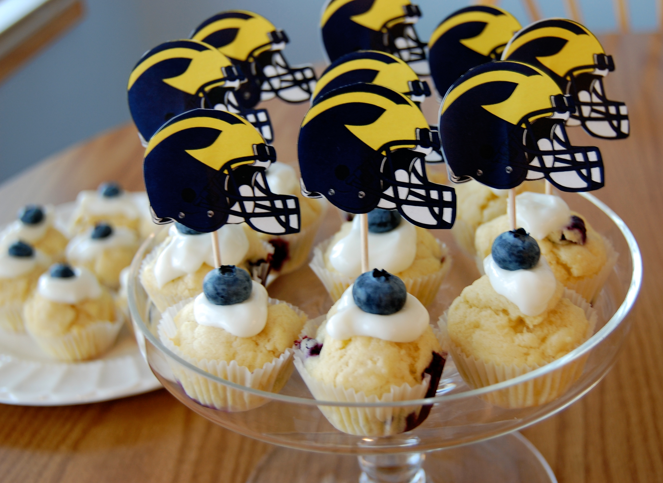 Again, the father of the 'baby boy on the way' is a huge University of Michigan fan, and since this is Illinois I could not find U of M decorations anywhere! So, I made my own and printed U of M helmets on a colored printer, taped them on toothpicks and stuck one into each cupcake.
