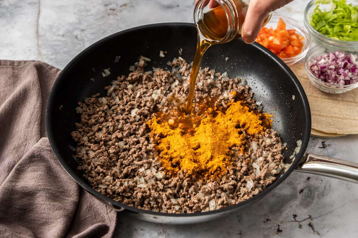 - Cook beef and onions in skillet with taco seasoning and beef broth.
