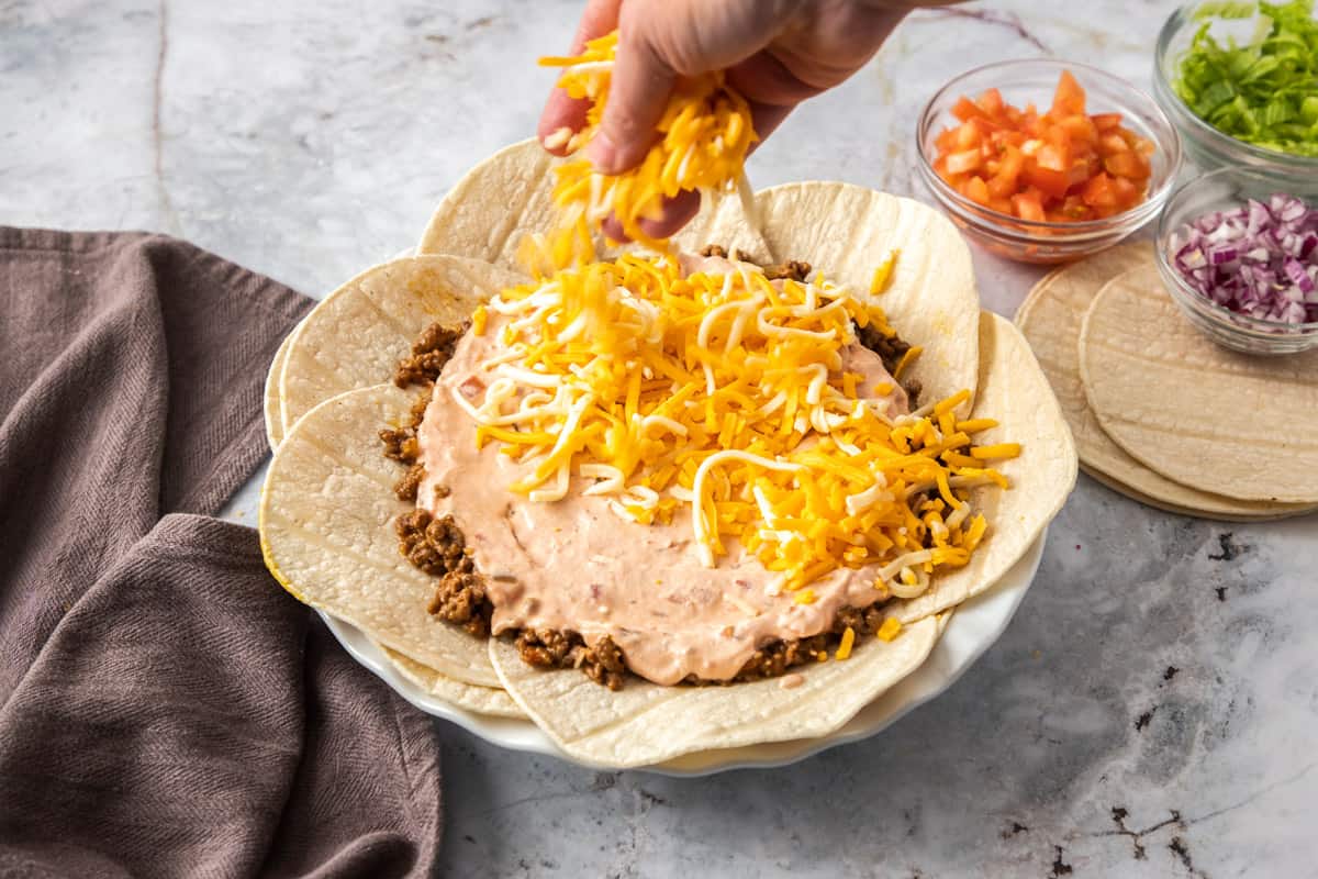 - In a medium bowl, combine salsa and sour cream to make a sauce. Spread ¼ cup sauce evenly into bottom of prepared pie dish. Layer 6 tortillas, slightly overlapping each other and the sides of the pie dish, then half of the meat mixture, and then half of the sour cream mixture. Top with half of cheese; repeat layers (starting with tortillas, ending with cheese).