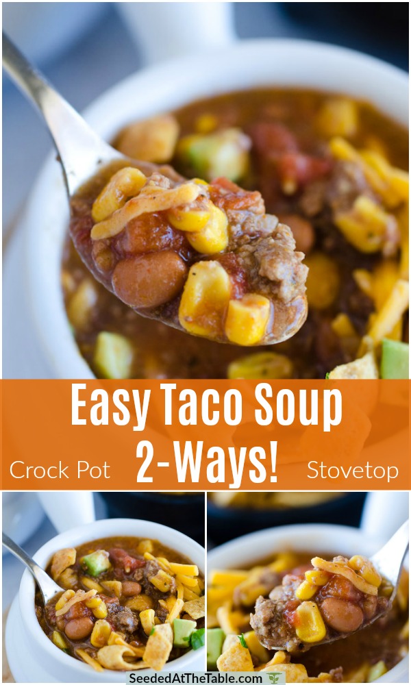 Our family favorite taco soup! It can be made on the stove top or in the crock pot. This taco soup recipe is as easy as it gets and feeds a bunch of people!