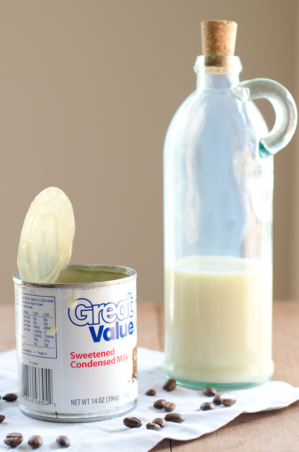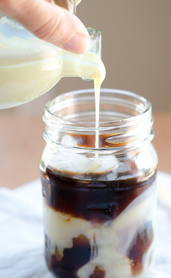 - Fill your cup with ice and pour in cold brew coffee concentrate, to about half way. Stir in sweetened condensed milk until combined. Add more coffee or condensed milk, to taste.