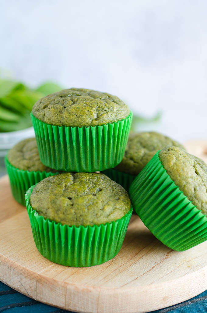 Fresh spinach is hidden in these sweet (no refined sugar) muffins giving them their fun green color. These spinach banana muffins are healthy muffins for kids, but adults love them, too!