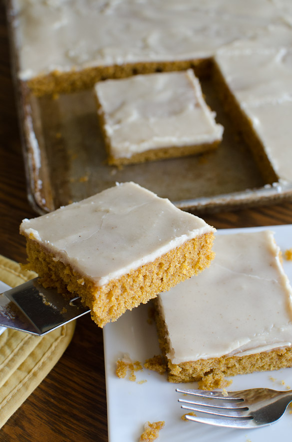 Pumpkin sheet cake is a fall favorite. Baked in a sheet pan, it is perfect for a crowd. Make this for Thanksgiving dessert!