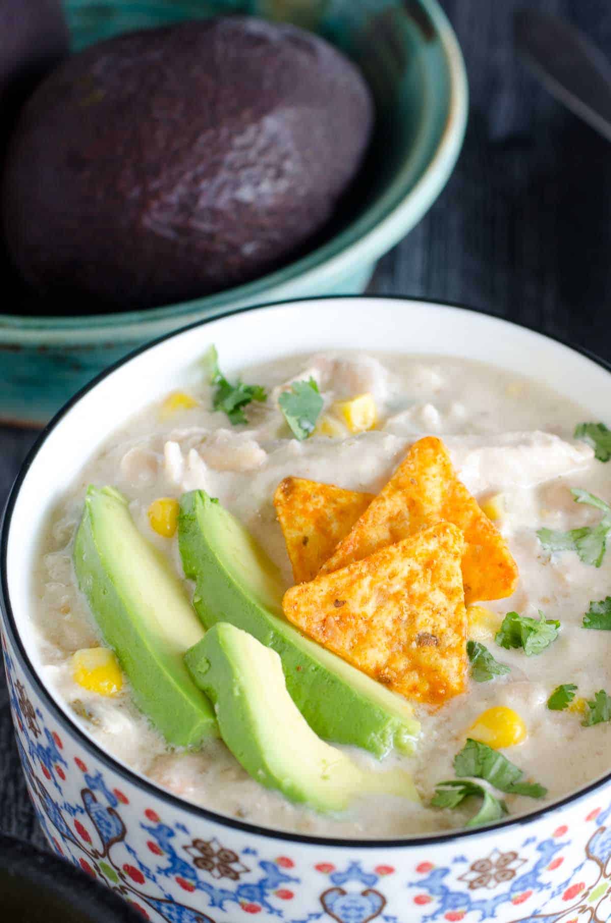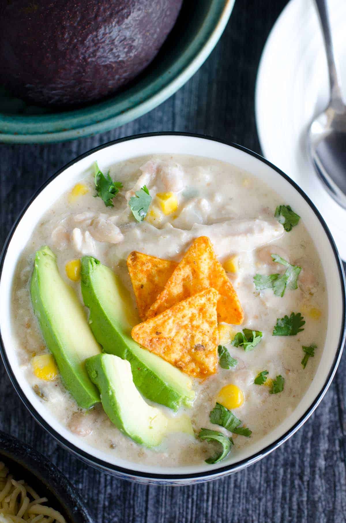 Serve white chicken chili with your favorite chili toppings such as tortilla strips, shredded cheddar cheese, sliced avocados, chopped fresh cilantro, sour cream and so on. My favorite side dish for this recipe is skillet corn bread. It's delicious for dipping into the white chili!